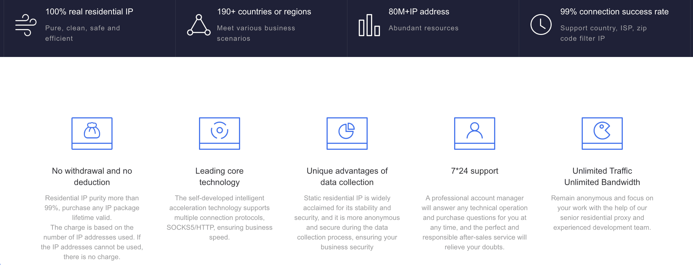 يوفر 360Proxy العديد من المزايا الفريدة ، بما في ذلك حركة المرور وعرض النطاق الترددي غير المحدود ، والدعم على مدار الساعة طوال أيام الأسبوع ، والتكنولوجيا الأساسية الرائدة ، والمزايا الفريدة لجمع البيانات .