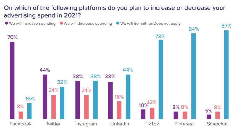 أشار المشاركون في الاستطلاع إلى أنهم يخططون لزيادة إنفاقهم على الإعلانات الاجتماعية في عام 2021 ، حيث يذهب نصيب الأسد من ميزانية إعلاناتهم الاجتماعية إلى Facebook ، يليه Twitter ، ثم Instagram.