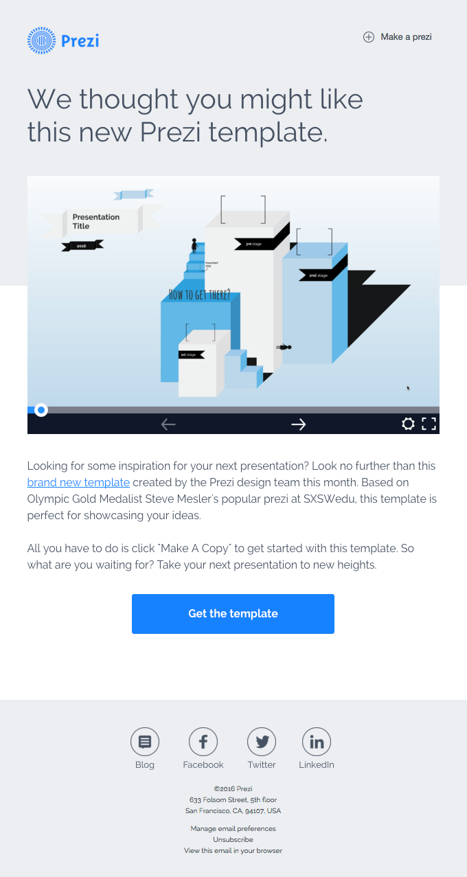 قد يحتاج هؤلاء الأشخاص غير المرتبطين بعلامتك التجارية إلى معرفة المزيد عنك ، وهذا يمنحك فرصة لمعرفة المزيد عنهم أيضًا. ما الذي يجعل سلبيّاك يتحوّلون إلى موالين؟ يقوم هذا البريد الإلكتروني من Prezi بعمل رائع في تقديم نموذج جديد ويسهل على القارئ الغوص في المنتج - وقد يعيد ذلك المستخدمين غير النشطين إلى Prezi.