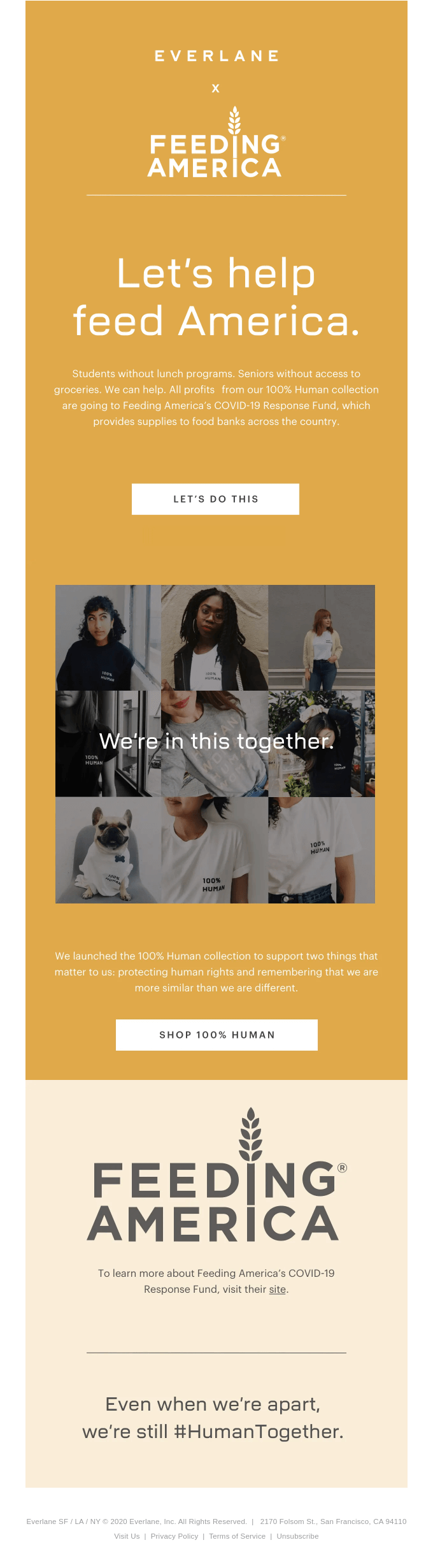 ماذا تفعل علامتك التجارية لدعم فريقك والمجتمع في هذه الأوقات العصيبة؟ يقل احتمال ترك العملاء لك إذا دعموا مهمتك ، لذا استخدم قوة البريد الإلكتروني لإظهار كيف تُحدث علامتك التجارية فرقًا. هذا البريد الإلكتروني من Everlane هو مثال رائع: