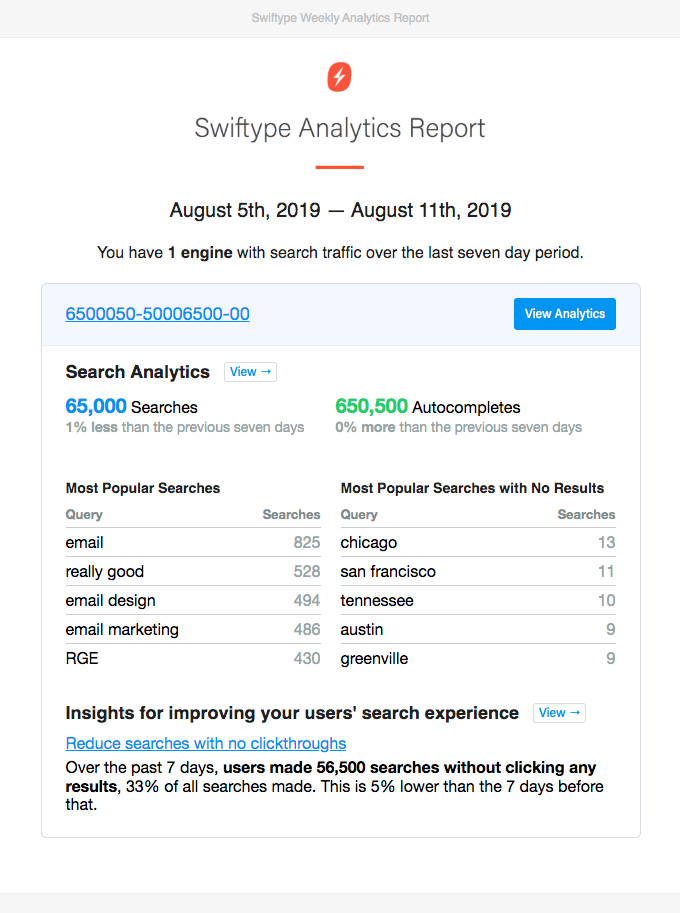 هذا مثال ممتع من Swiftype. أنها توفر ملخصًا لطيفًا ومتمرسًا لنشاط الكتابة الخاص بك مع تحديثات على تغييراتك الأسبوعية: