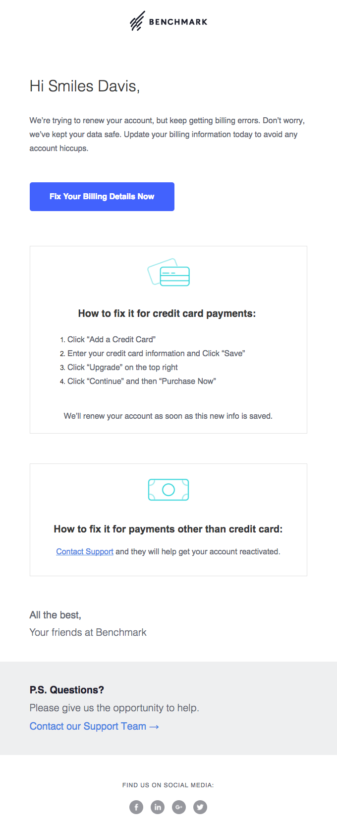 يحتوي هذا المثال من Benchmark على التوازن المثالي بين الدعم والتعاطف مع إخبارك بفشل الدفع ببطاقتك الائتمانية: