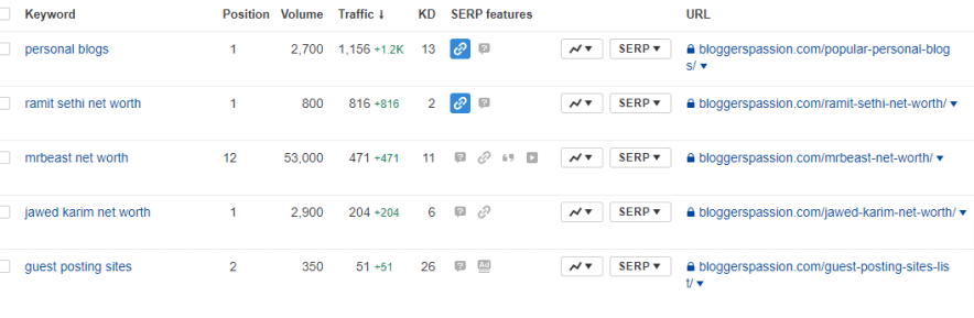 كما ترى ، ستجد جميع الكلمات الرئيسية التي يقوم منافسوك بترتيبها حاليًا ، إلى جانب البيانات التالية ؛