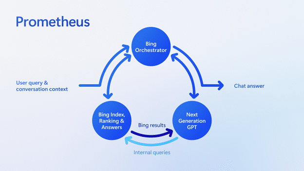 يستفيد بروميثيوس من قوة نماذج Bing واللغة لإنشاء مجموعة من الاستعلامات الداخلية بشكل متكرر من خلال مكون يسمى Bing Orchestrator. يهدف إلى توفير إجابة دقيقة وغنية لاستعلام المستخدم ضمن سياق المحادثة المحدد. كل ذلك في غضون أجزاء من الثانية. نشير إلى هذه الإجابة التي أنشأها بروميثيوس على أنها إجابة الدردشة.