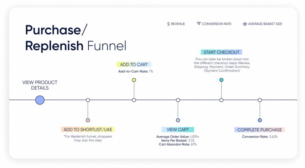 حاليًا ، تتمتع المنتجات المتعلقة بالصحة والجمال بمعدل تحويل في التجارة الإلكترونية يبلغ 3.08٪. إذا كان معدل التحويل الخاص بك أقل من هذا المعيار ، فيجب عليك مراجعة مسار الشراء / التجديد وتحسينه. المفتاح هو تحليل معدلات التحويل من مرحلة واحدة في مسار التحويل إلى المرحلة التالية ومعرفة ما يدفع العملاء إلى اتخاذ إجراء.