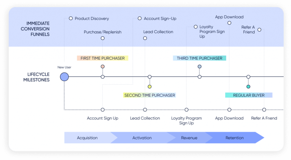 تتمثل إحدى طرق تسهيل هذه العملية في تقييم مراحل دورة حياة حلقة ولاء العميل. في كل مرحلة من مراحل دورة الحياة ، يجب على العلامات التجارية تحسين مسارات التحويل الفورية المهمة.