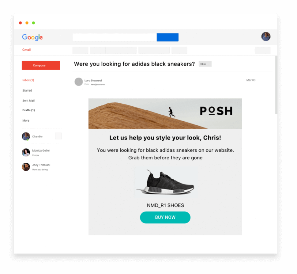 أثناء نقرها للوصول إلى موقع الويب ، بدأت أول عملية دخول "قابلة للتسجيل" لها في رحلة العميل. أثناء تصفح منتجات أحمر الشفاه ، تشتت انتباهها وتخلت عن عربتها وغادرت. بعد ساعة ، حصلت على دفعة ويب. في وقت لاحق ، وصلت رسالة بريد إلكتروني ذكرتها بأنها تركت شيئًا في عربة التسوق الخاصة بهم. لكنها كانت في طريقها إلى المنزل ، لذلك تجاهلت البريد الإلكتروني. في ذلك المساء ، أعطاها إعلان مستهدف على Facebook آخر موجه تحتاجه. قرأت التعليقات ، وشعرت بالإثارة ، وقررت الشراء.