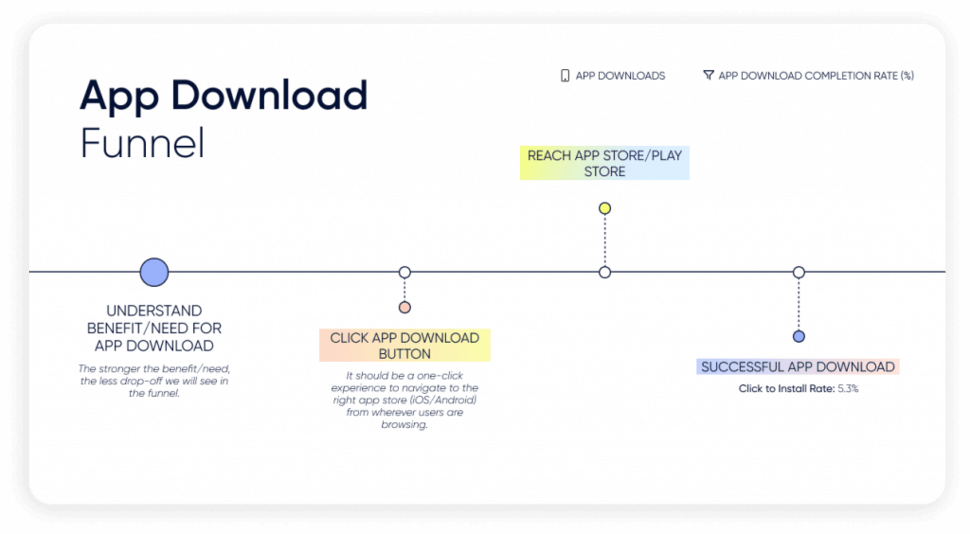 في مسار التحويل هذا ، يشير معدل النقر للتثبيت إلى النسبة المئوية للمستخدمين الذين قاموا بتثبيت التطبيقات بنجاح بعد النقر فوق ارتباط لتنزيل أحد التطبيقات. يختلف اختلافًا كبيرًا عبر القنوات المختلفة المصممة لدفع المستخدمين إلى تنزيل التطبيق ، على سبيل المثال ، عبر لافتة تنزيل تطبيق ما بعد الشراء أو لافتة ذكية.