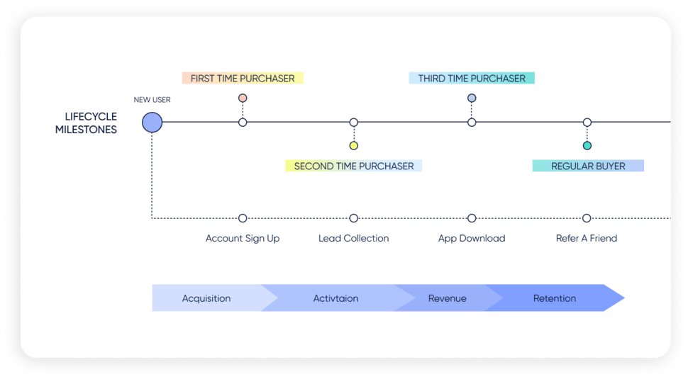 في هذا النموذج ، تحدد معالم دورة الحياة رحلة حياة كل عميل مع علامتك التجارية في طريقهم إلى أن يصبحوا عملاء مخلصين وذوي قيمة عالية. تحدد هذه المعالم مراحل مراحل دورة حياة العميل.