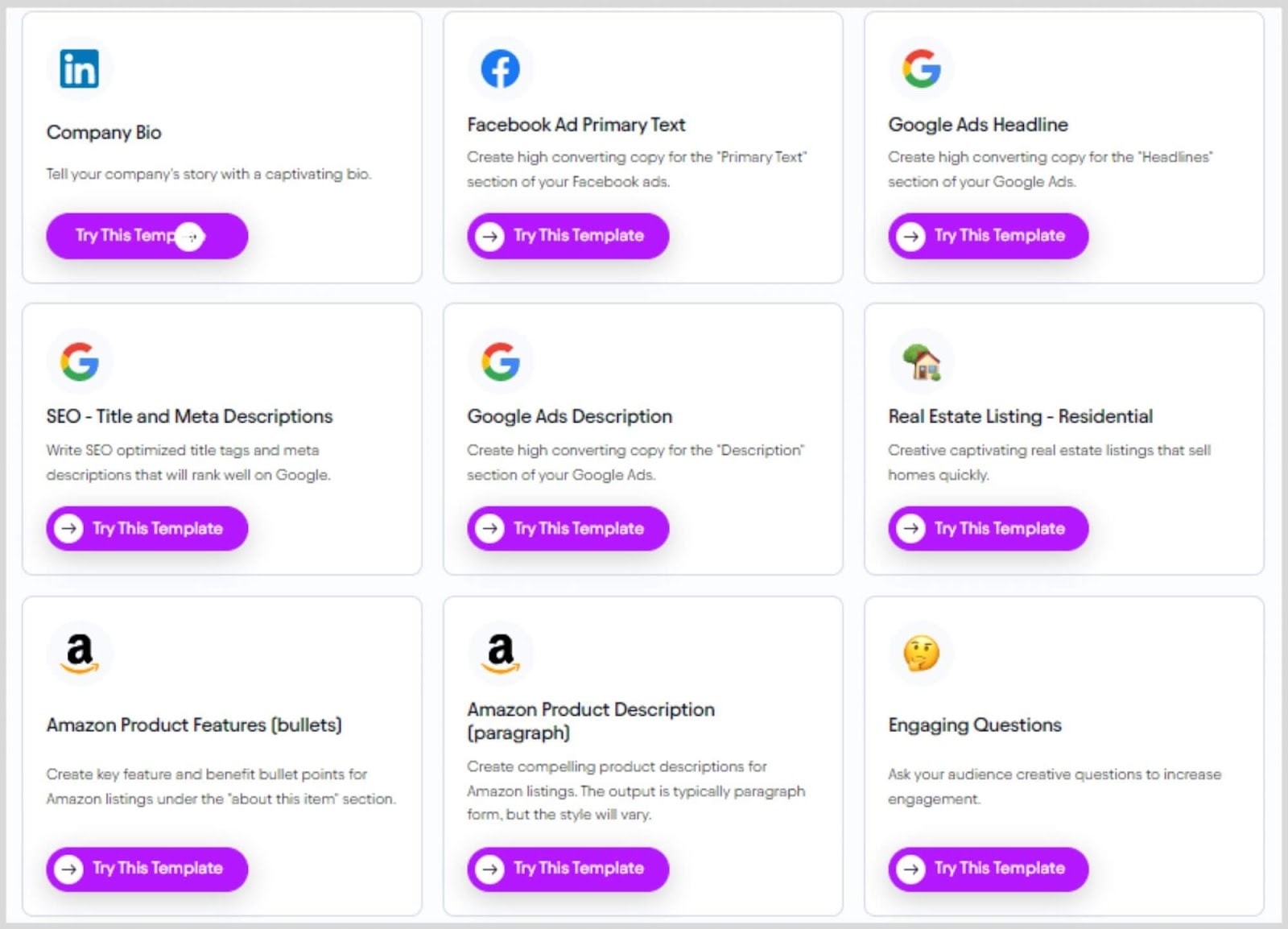- أكثر من 90 نموذجًا للكتابة الإعلانية : يتضمن ذلك قوالب لنسخ الإعلانات الرقمية ونسخ التجارة الإلكترونية ومحتوى الوسائط الاجتماعية.
