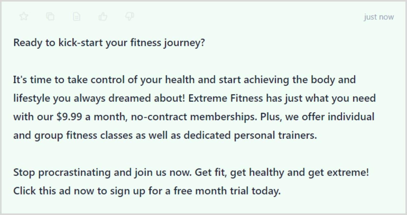 ثم سألني جاسبر عن وصف المنتج. أضفت هذه التفاصيل: "9.99 دولارًا شهريًا ، بدون عقود ، صفوف لياقة فردية وجماعية ، مدربون شخصيون مخصصون".