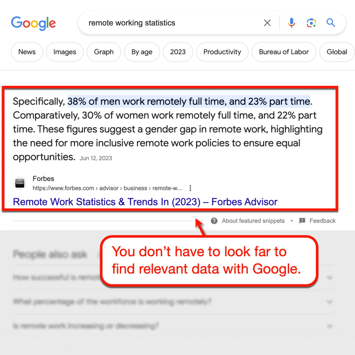 على سبيل المثال، إذا كنت تريد البحث عن إحصائيات حول العمل عن بعد، فما عليك سوى استخدام استعلام بحث Google أدناه (أو شيء مشابه):