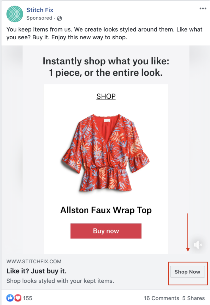 ربما تكون قد رأيت أمثلة على العبارات التي تحث المستخدم على اتخاذ إجراء مثل هذا في الإستراتيجية الإعلانية لعلامات التجارة الإلكترونية. الهدف الرئيسي هو البيع. في الوقت نفسه ، يركز الإعلان على التجربة بدلاً من التسرع في نقل المستخدم إلى صفحة ويب. في هذه الحالة ، "تسوق الآن" هو نوع CTA المباشر ، ومع ذلك ، فإن نسخة الإعلان تقوم بمعظم عمليات البيع.