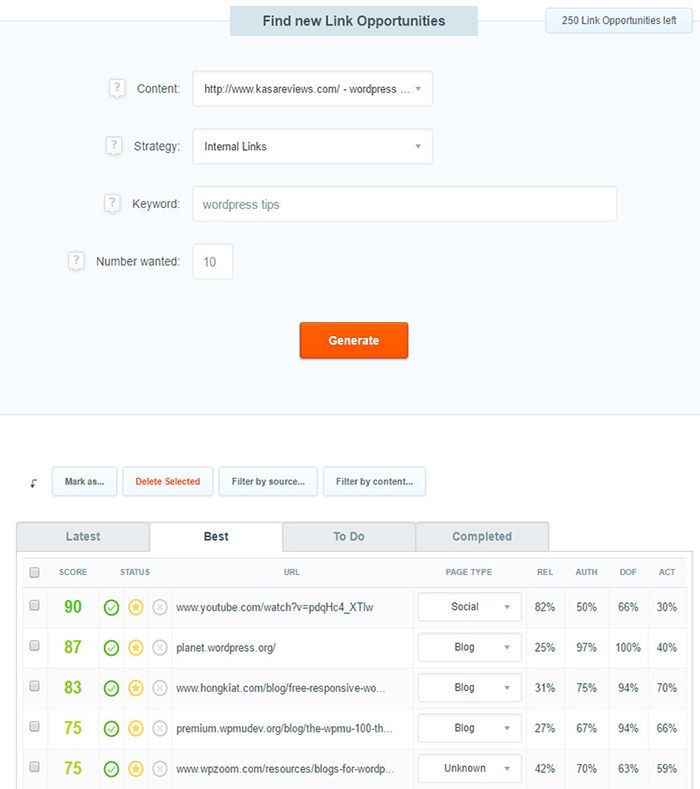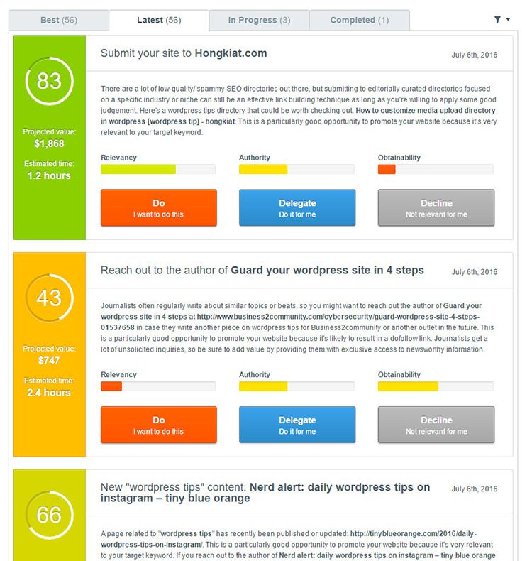 سيجد CanIRank العديد من فرص الارتباط المحتملة ، ويقيم كل واحدة وفقًا لمدى ملاءمتها لكلمتك الرئيسية المستهدفة ، وسلطة الصفحة ، ونسبة الروابط الخارجية على الصفحة ، ومدى قابلية التنفيذ هي الفرصة. من الأفضل التفكير في الترويج للمحتوى على أنه مهمة متكررة منتظمة وليس مهمة لمرة واحدة.