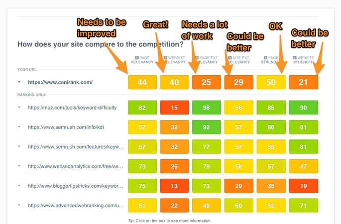 مع كل هذه البيانات ، يمكن لـ CanIRank أن يوضح لك تحديدًا ما هو موقع الويب الخاص بك قصيرًا ، إلى جانب التغييرات الموصى بها التي يمكنك إجراؤها لتحسين تصنيفاتك .