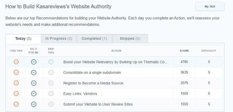 هنا سوف تتلقى أهم التوصيات لبناء سلطة موقع الويب الخاص بك. في كل يوم تكمل فيه إجراءً ، سيتم إعادة تقييم موقع الويب الخاص بك وستحصل على توصيات إضافية.