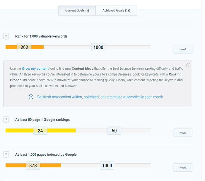استنادًا إلى تحليل CanIRank لموقع الويب الخاص بك والمنافسة ، سترى الأهداف الحالية والمحققة لتحسين مناطق موقع الويب الخاص بك من أجل الحصول على تأثير إيجابي على حركة المرور والمبيعات على موقعك.