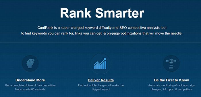 تركز معظم أدوات تحسين محركات البحث على تزويدك بالبيانات والإحصاءات والمعلومات وما إلى ذلك ، لكنها لا تخبرك بما يجب عليك فعله بكل هذه المعلومات . يحاول CanIRank استبدال الذكاء البشري لخبير تحسين محركات البحث بـ "ذكاء الكمبيوتر". باستخدام CanIRank تحصل على نصائح واضحة وقابلة للتنفيذ ، وليس مجرد أرقام أولية.