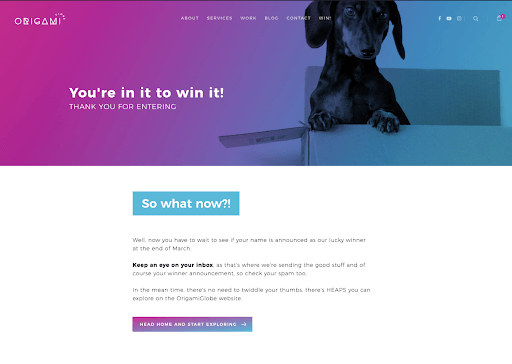 مرة أخرى في عام 2015 عندما أخبرني مديري في ذلك الوقت أن الاتصال البارد هو مستقبل التسويق (!) قررت أن الوقت قد حان لأخذ كل المعرفة التسويقية المذهلة للمسابقة التي اكتسبتها من العمل على الترقيات بالجوائز الوطنية والعالمية وبدء OrigamiGlobe ، وهي وكالة تسويق متخصصون في المسابقات والهدايا ويشار إلينا من قبل عملائنا باسم "ملكة المنافسة" عندما يتعلق الأمر بتصميم مسابقات التسويق.