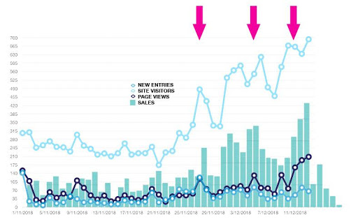 تشير الأسهم الوردية إلى التواريخ التي قدمنا فيها هدايا الفلاش. ارتفاع المبيعات حول هدايا الفلاش!