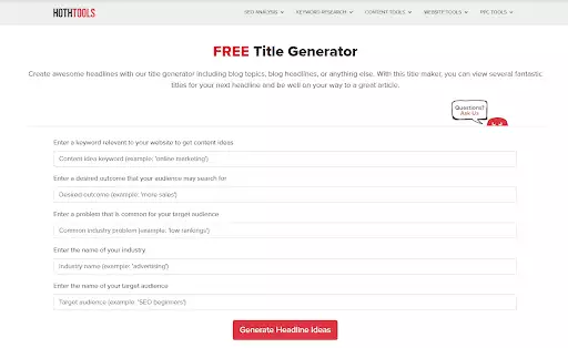 استنادًا إلى البيانات التي تقدمها ، سينشئ مُنشئ العنوان المجاني من hot أفكارًا لعنوان المدونة ويقترحها ويقلل من إجهادك في ثوانٍ.
