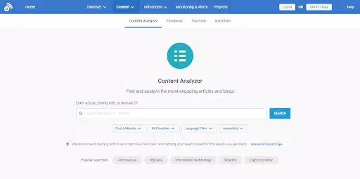 يستخدم معظم المسوقين BuzzSumo لتوليد الأفكار. باستخدام الإصدار المجاني ، يمكنك استخدام أداة تحليل المحتوى للبحث عن الكلمات الرئيسية وتحسين النتائج وتحليل البيانات والرؤى ومقارنة النتائج.