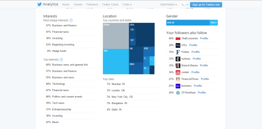 التحليل الخاص بنا : تتيح لك علامة التبويب "المتابعون" في صفحة "التحليلات" الخاصة بك معرفة الموضوعات التي تهم متابعيك أكثر من غيرها. على سبيل المثال ، سيهتم 30٪ من متابعيك بالتكنولوجيا أو 55٪ من متابعيك مهتمين بالتسويق الرقمي. يمكنك استخدام هذه المعلومات لإنشاء محتوى وتخطيط استراتيجيات التسويق الخاصة بك مع الأخذ في الاعتبار اهتمام متابعيك وبالتالي إفادة عملك.