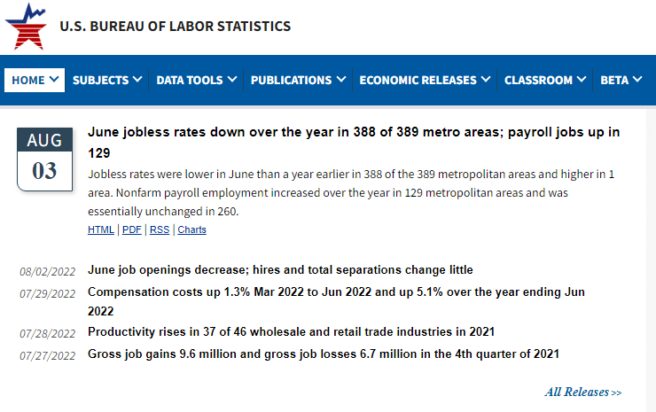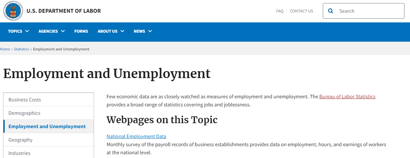 تعد وزارة العمل الأمريكية واحدة من أشهر أمثلة التوظيف لمصادر البيانات. سواء كنت ترغب في الحصول على تفاصيل إحصائيات المهنة أو بيانات البطالة ، فقد غطت هذا الموقع.