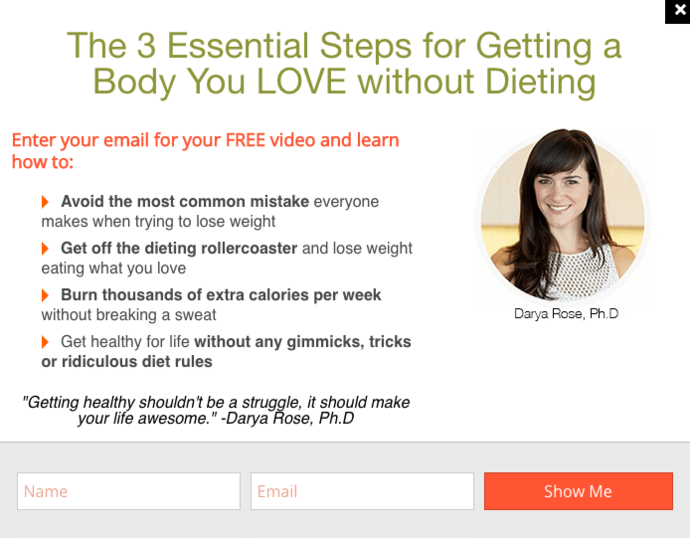 إنه يسلط الضوء على فائدة كبيرة (الجسم الذي تحبه دون اتباع نظام غذائي) بينما لا يزال يخبرك بوضوح بما تحصل عليه بالفعل من خلال ملء النموذج (فيديو مجاني لتحصل على هذا الجسم الخالي من النظام الغذائي).
