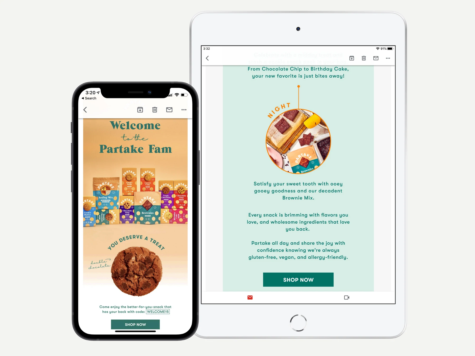 تُنشئ شركة Partake ، وهي شركة أغذية خالية من الغلوتين ونباتي ومضاد للحساسية ، رسائل بريد إلكتروني نابضة بالحياة تبدو رائعة عبر الأجهزة.