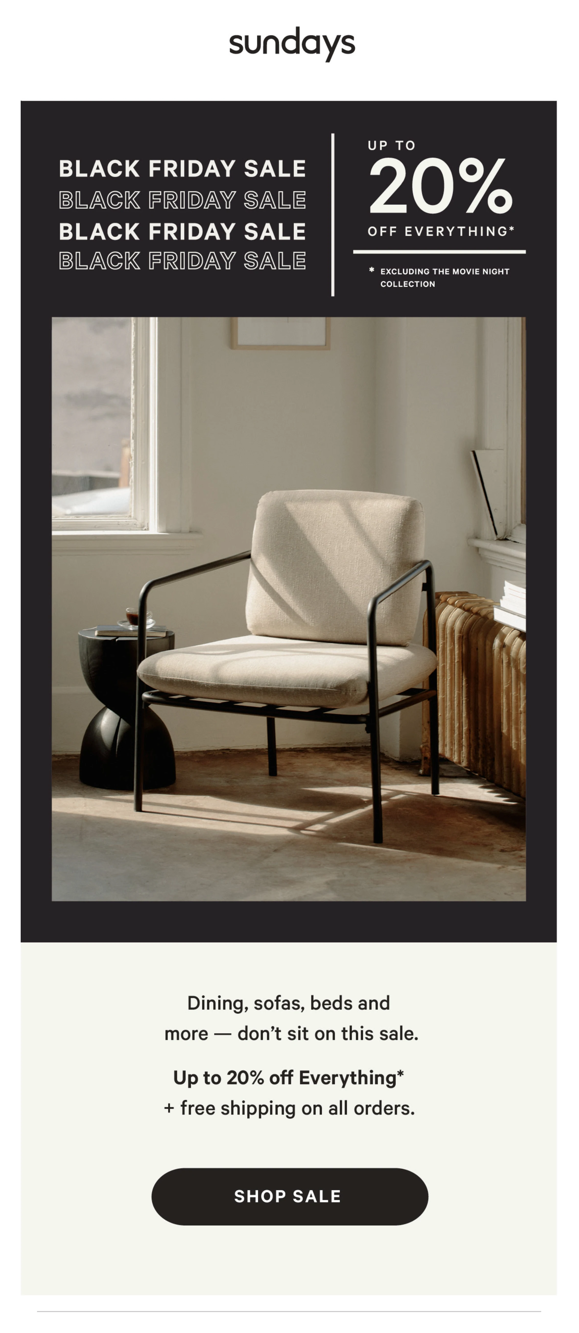 أرسلت شركة Sundays ، وهي شركة أثاث ، رسائل بريد إلكتروني قصيرة ومحددة بشأن أكبر عملية بيع لها خلال العام خلال يوم الجمعة الأسود وإثنين الإنترنت.