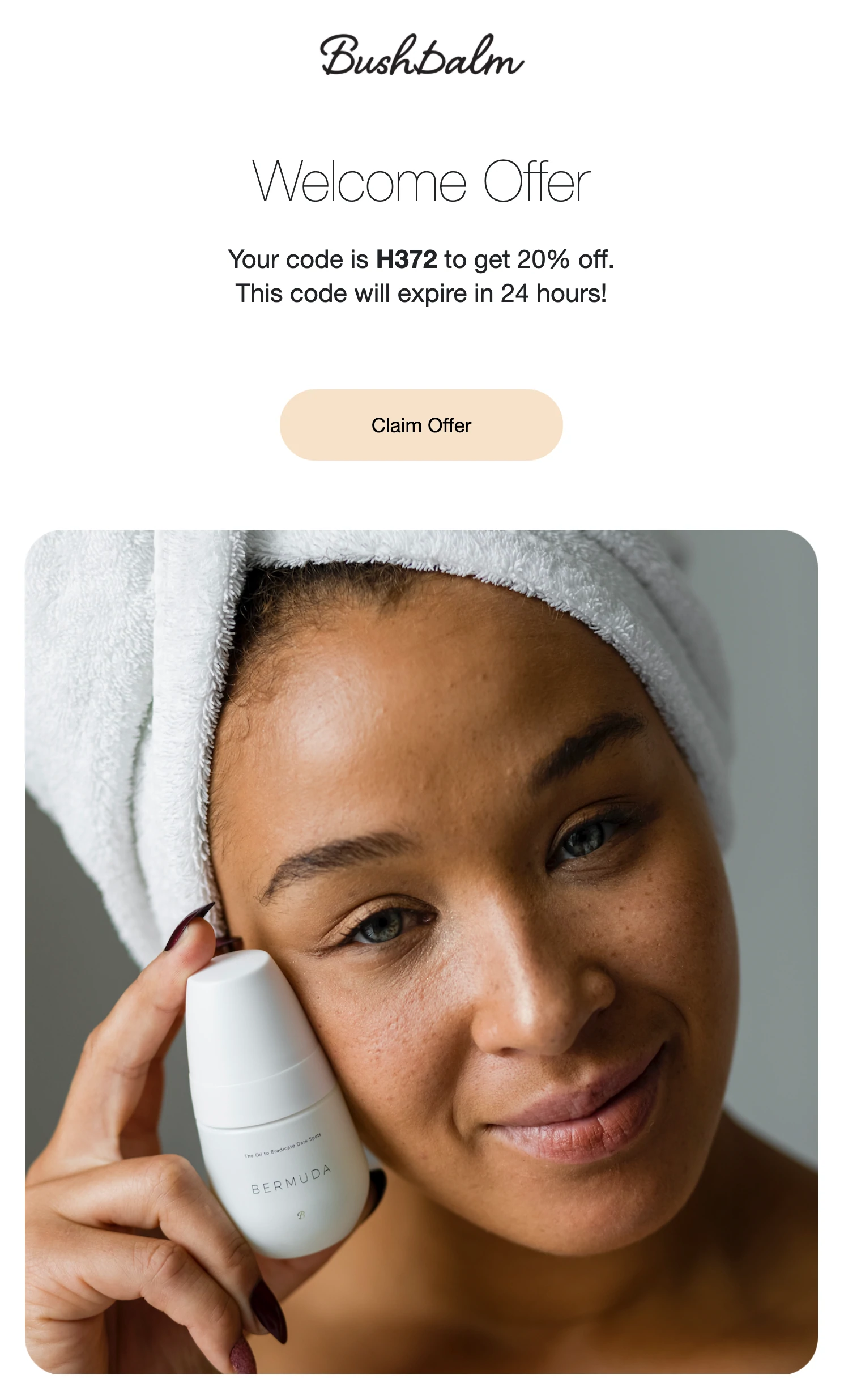تشجع شركة Bushbalm ، وهي شركة تطور خط إنتاج طبيعي للعناية بالبشرة ، زوار الموقع على الاشتراك في قائمتها البريدية بخصم ترويجي. في البريد الإلكتروني الترحيبي ، يقدم عرضًا خاصًا لفترة محدودة للمشتركين الجدد.