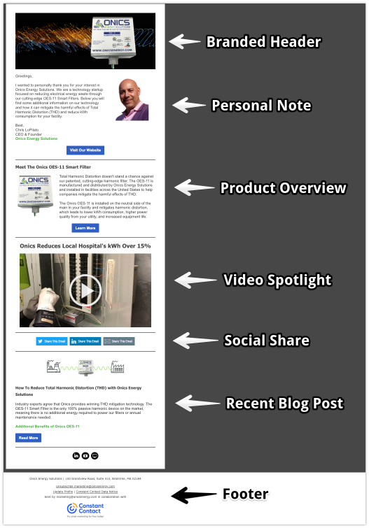 على سبيل المثال ، ألق نظرة على نموذج حوض المطبخ هذا لبدء تشغيل الطاقة في بوسطن ، Onics Energy Solutions. في كل مرة يقرر Chris LoPilato والفريق في Onics Energy إنشاء حملة بريد إلكتروني جديدة لمشتركيهم ، يمكنهم نسخ هذا القالب وإضافة أقسام أو إزالتها كما يرون مناسبًا ، مما يوفر قدرًا كبيرًا من الوقت ويضمن اتساق العلامة التجارية مع كل إرسال.
