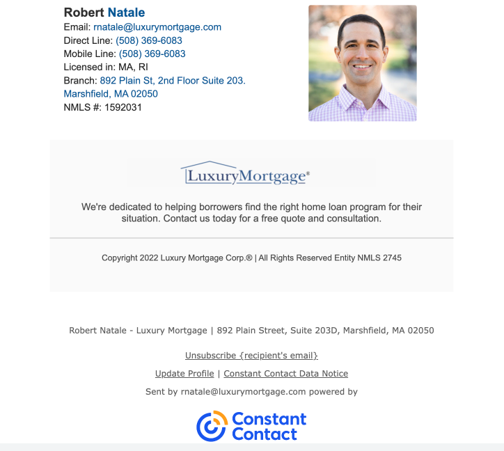 إليك نظرة على تذييل بريد إلكتروني مصمم جيدًا لروبرت ناتالي مع Luxury Mortgage :