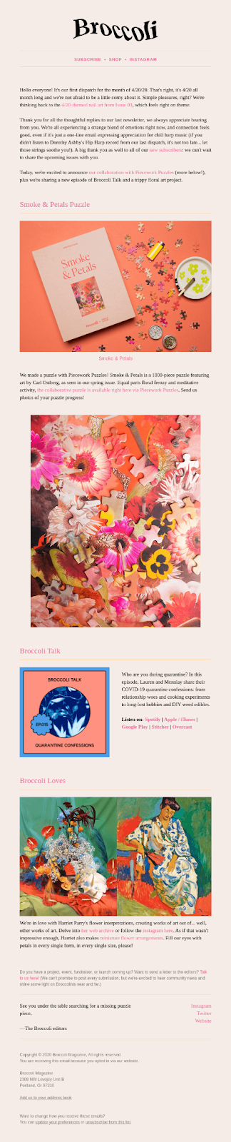 هذا نوع من مثل التسجيل في نوع بريد إلكتروني "العنصر متوفر مرة أخرى في المخزون". نحن نعلم أن هذه ليست علامة تجارية للقنب ، لكنها مثال رائع من السلع العامة على بريد إلكتروني بسيط متوفر في المخزون ينجز المهمة.