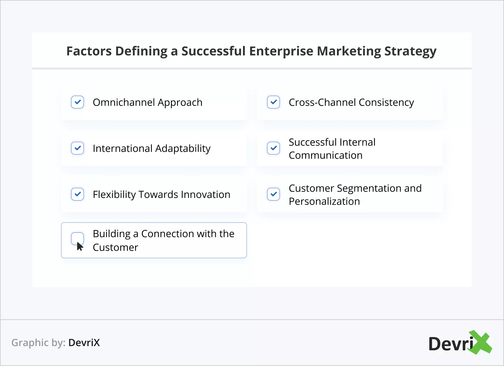 في حين أن كل هذا يبدو صعب التنفيذ والإدارة ، إلا أنه يستحق ذلك في النهاية. مع إستراتيجية تسويق المؤسسة الصحيحة ، يمكن لشركتك أن تنمو وتزدهر وتفتح أسواقًا جديدة بنجاح.