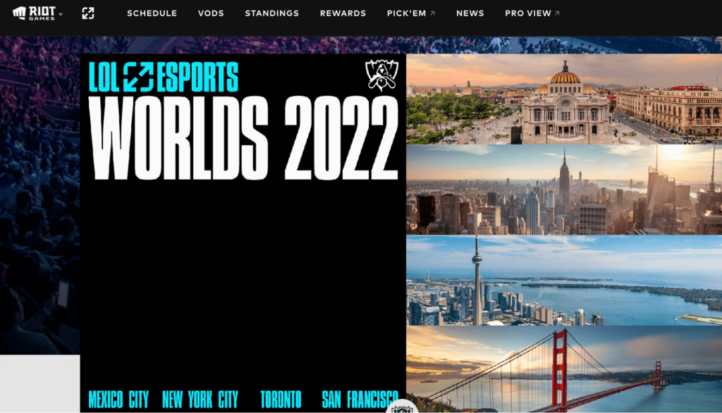 أكبر منافسة في League of Legends ، بطولة العالم ، هي أكبر بطولة للعبة. في عام 2022 ، عادت البطولة لتكرارها الثاني عشر مع بطولات في مكسيكو سيتي ونيويورك وتورنتو وسان فرانسيسكو. هذه المنافسة هي ذروة مسابقة League of Legends ؛ يتنافس 12 فريقًا من مناطق مختلفة على لقب بطل العالم. يشارك أربعة وعشرون فريقًا من 12 دوريًا احترافيًا لشركة Riot Games في البطولة التي تستغرق شهرًا.