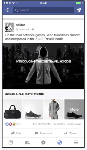 تعد إعلانات Facebook Collection طريقة رائعة لتوفير ميزة تسليط الضوء على المنتج بشكل مرئي للغاية، كل ذلك ضمن موضع الإعلان. على الرغم من أنه متاح فقط في خلاصات Facebook، إلا أن هذا النوع من الإعلانات يسمح بصورة غلاف أو مقطع فيديو (كلاهما متاح في إعلانات المجموعة) لعرض العديد من المنتجات. بالإضافة إلى ذلك، عندما ينقر المستخدمون على إصدار ملء الشاشة، يتم إرسال المستخدمين إلى تجربة فورية (كانت تسمى سابقًا Canvas). هنا، يتم توجيه المستخدمين إلى تجربة تفاعل عبر الهاتف المحمول قابلة للتمرير لمعرفة المزيد حول العلامة التجارية.