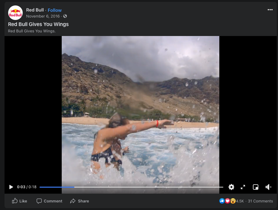 غالبًا ما تُظهر إعلانات الفيديو على Facebook الرياضيين يقومون بأشياء مذهلة. لاحظ التفاصيل الصغيرة في لقطة الشاشة للفيديو أدناه: رباط المعصم الأحمر الذي يرتديه الرياضي يتناقض مع اللون الأزرق للمحيط. أثناء مشاهدة بقية الفيديو هنا ، لاحظ الاستخدام المتكرر للأحمر والأزرق طوال الوقت.