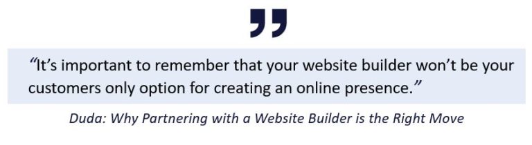 يكتب Duda ، "من المهم أن تتذكر أن منشئ موقع الويب الخاص بك لن يكون الخيار الوحيد لعملائك لإنشاء تواجد عبر الإنترنت. إن منشئي مواقع الويب المخصصين الذين يخدمون الشركات الصغيرة بشكل مباشر مثل Wix و Squarespace لديهم فرق هندسية وتسويقية ضخمة ، وسيتم وضع الحل الداخلي الخاص بك في منافسة مباشرة مع هذه الأنظمة الأساسية ".