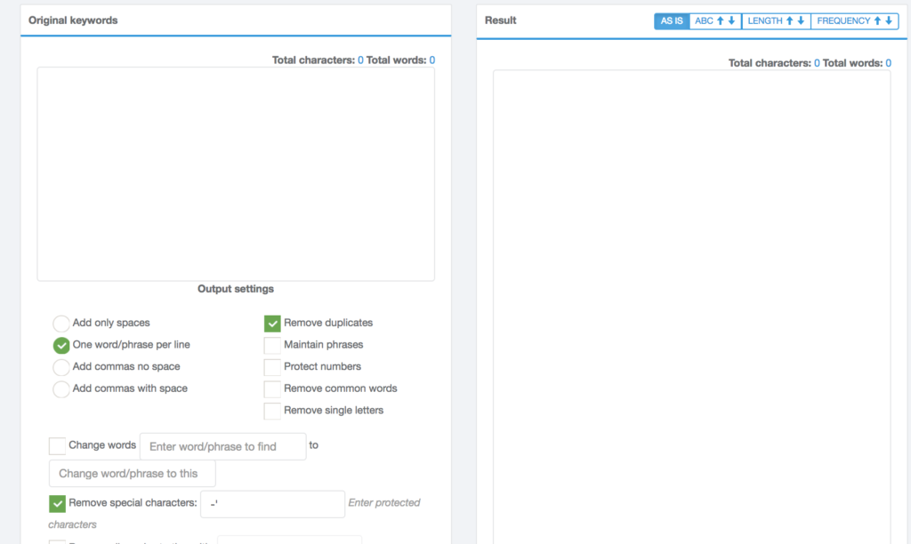 حرك جميع كلماتك الرئيسية الجميلة في المربع الموجود على اليسار ، وحدد الخيارين "كلمة / عبارة واحدة فقط في كل سطر" و "إزالة التكرارات". ثم انقر فوق "معالجة".