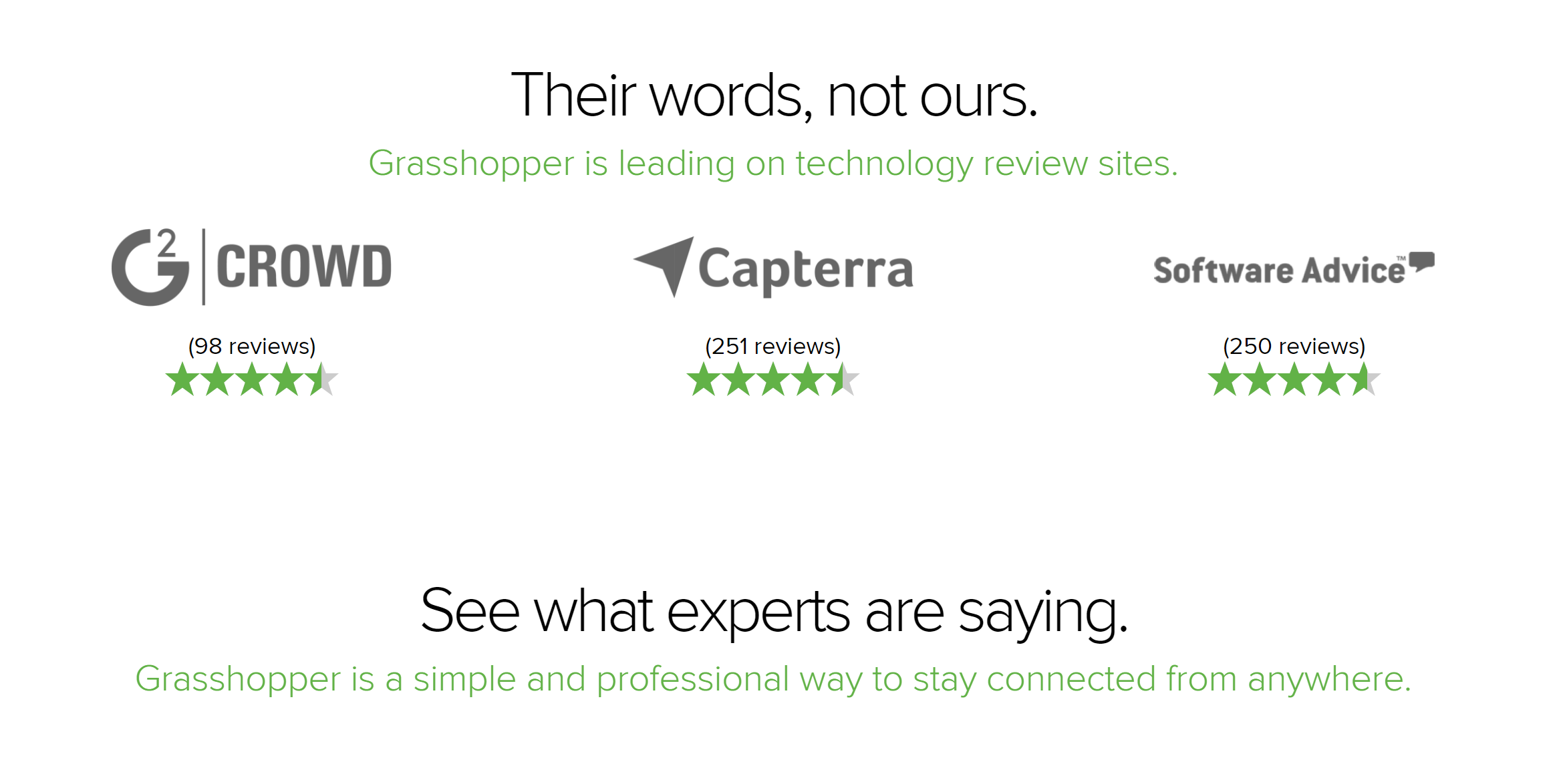 متوافق مع الأجهزة المحمولة: يمكن استخدام Grasshopper مع الهواتف القائمة على السحابة وكذلك الهواتف الذكية. يمكن للمستخدمين الوصول إلى حساباتهم وإدارتها مباشرةً من تطبيق جوال متوفر على أجهزة Android و Apple.