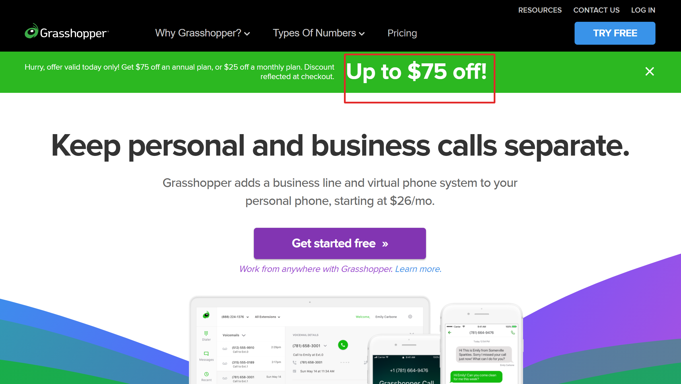 Bottom Line Upfront: Grasshopper هو نظام هاتف افتراضي مذهل يمكن أن يساعدك في فصل المكالمات الشخصية والتجارية على نفس الرقم. يمنحك بشكل أساسي رقم هاتف ثانٍ على نفس مزود الخدمة. ستتم إعادة توجيه جميع مكالمات Grasshopper على رقمك الرئيسي. مع عرضنا الخاص ، يمكنك توفير ما يصل إلى 10٪ على Grasshopper.