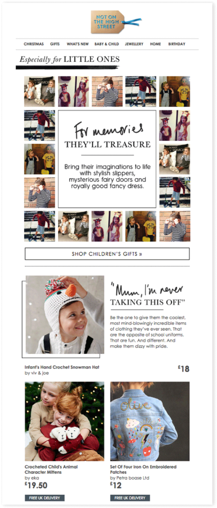 الاحتمال الآخر هو تقسيم توصيل دليل الهدايا إلى عدة "أقساط" مواضيعية ، على سبيل المثال ، واحدة في الأسبوع. هذا ما يفعله Notonthehighstreet ، كما يتضح من المعرض أدناه. إنها تضيف فارقًا بسيطًا إلى موضوع الهدية من خلال حملة بالتنقيط بنبرة حنين وعاطفية - وتضعها في مركز الصدارة.