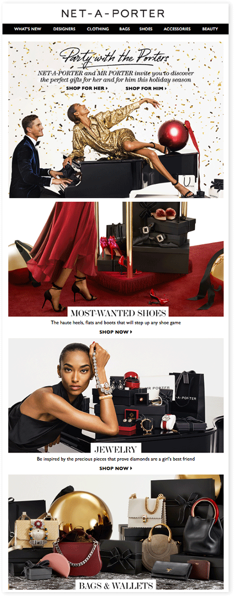 - من خلال التأكيد على فئات معينة ، مثل أكثر الأنواع مبيعًا أو الأنواع الأكثر شراءًا كهدايا ، مثل Net-A-Porter في المثال أدناه