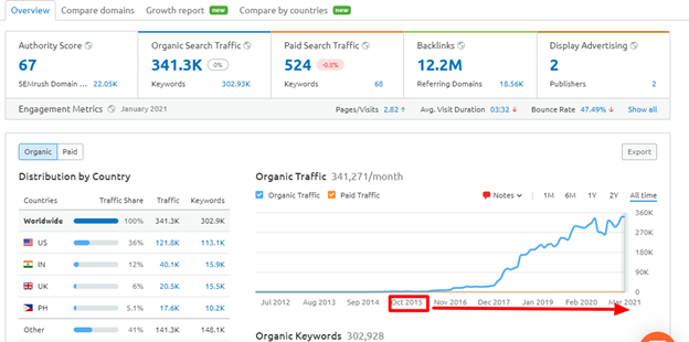 في الصورة أعلاه ، استغرقت العلامة التجارية ما يقرب من ثلاث سنوات لتصل إلى 100000 زائر شهريًا ثم ثلاث سنوات أخرى للوصول إلى أكثر من 340.000 زائر شهريًا. اليوم ، تعد محركات البحث مسؤولة عن غالبية حركة المرور والإيرادات.