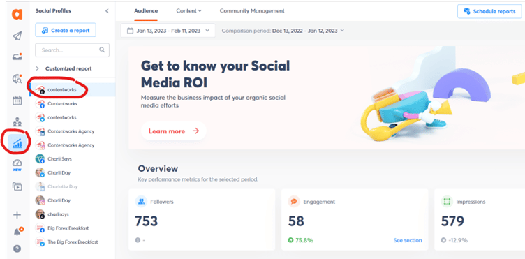 أولاً يمكنك الاطلاع على تقرير فوري عن جمهورك والمحتوى وإدارة المجتمع. تخبرك علامة تبويب الجمهور بعدد المتابعين ومتوسط المشاركة ومرات الظهور. يخبرك أيضًا بالمنطقة الديموغرافية لجمهورك وساعات الإنترنت الشائعة.