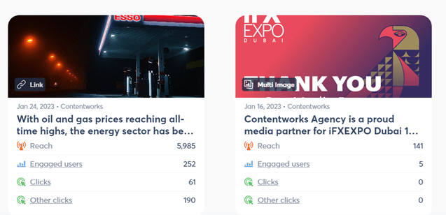 لاحظ أيضًا أن التقرير المجمع يبدو مختلفًا على كل شبكة ، بسبب الإحصائيات المتاحة وما إذا كان مقطع فيديو أو منشورًا ثابتًا به رابط.