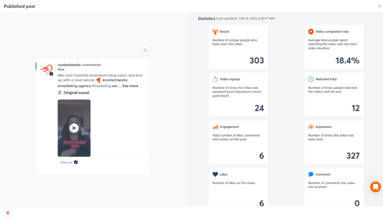 باستخدام Agorapulse ، ما عليك سوى النقر فوق TikTok المنشور للاطلاع على الإحصائيات. ليست هناك حاجة لسحب أي تقارير أو تعيين معلمات. تعكس هذه الإحصائيات تلك المتوفرة في تطبيق TikTok حتى تتمكن من الحصول عليها هنا دون الحاجة إلى فتحها والتنقيب في كل مقطع فيديو.