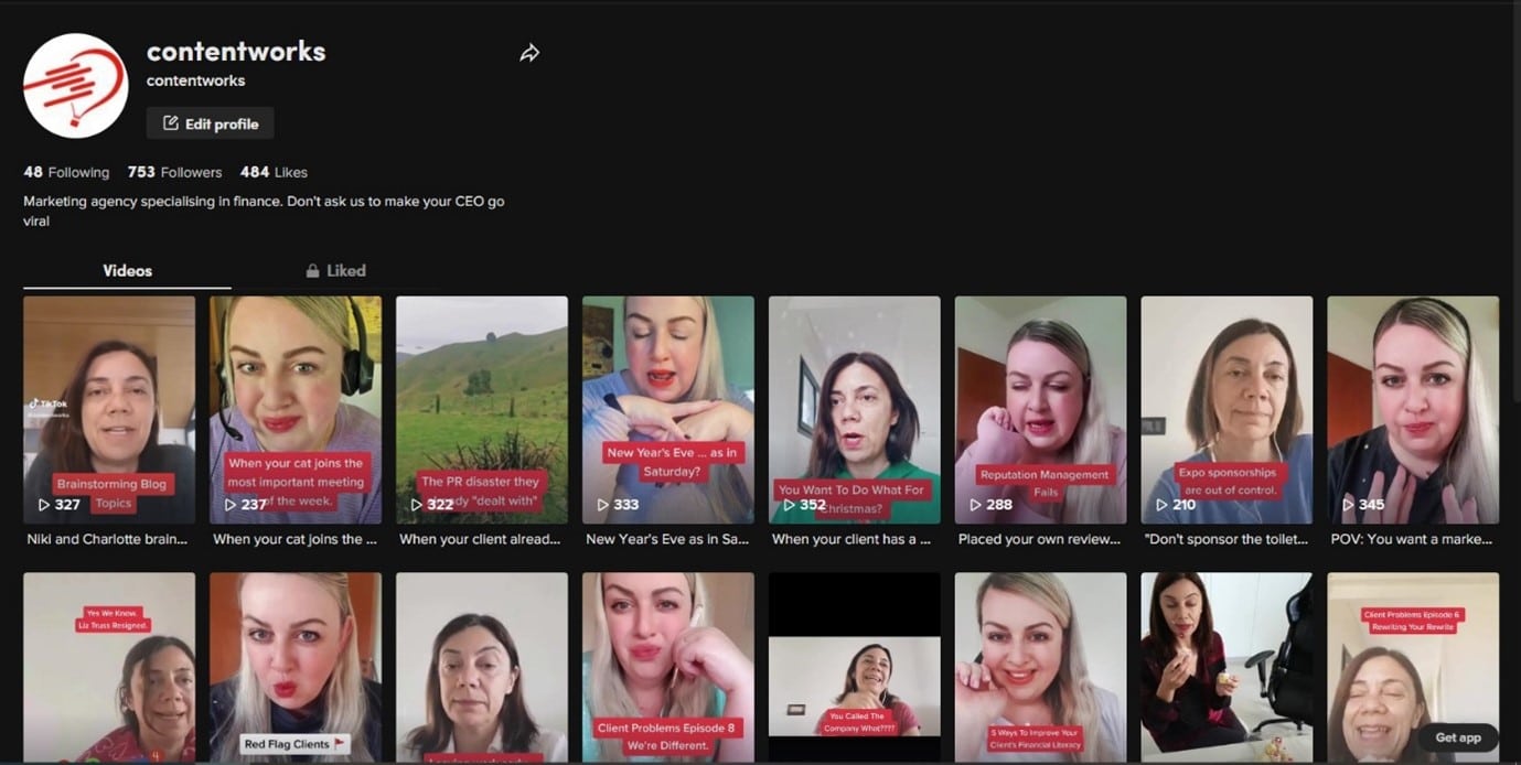 على سبيل المثال ، تتميز قناةcontentworks TikTok بمشاكل العميل ودردشة الوكالة والأمور الغريبة وراء الكواليس.